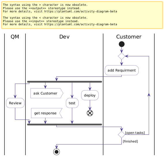Mit PlantUML erfolgt die Modellierung eine fussgesteuerten Schleife mit einem repeat / repeat while () is ([guard ])-Block:
